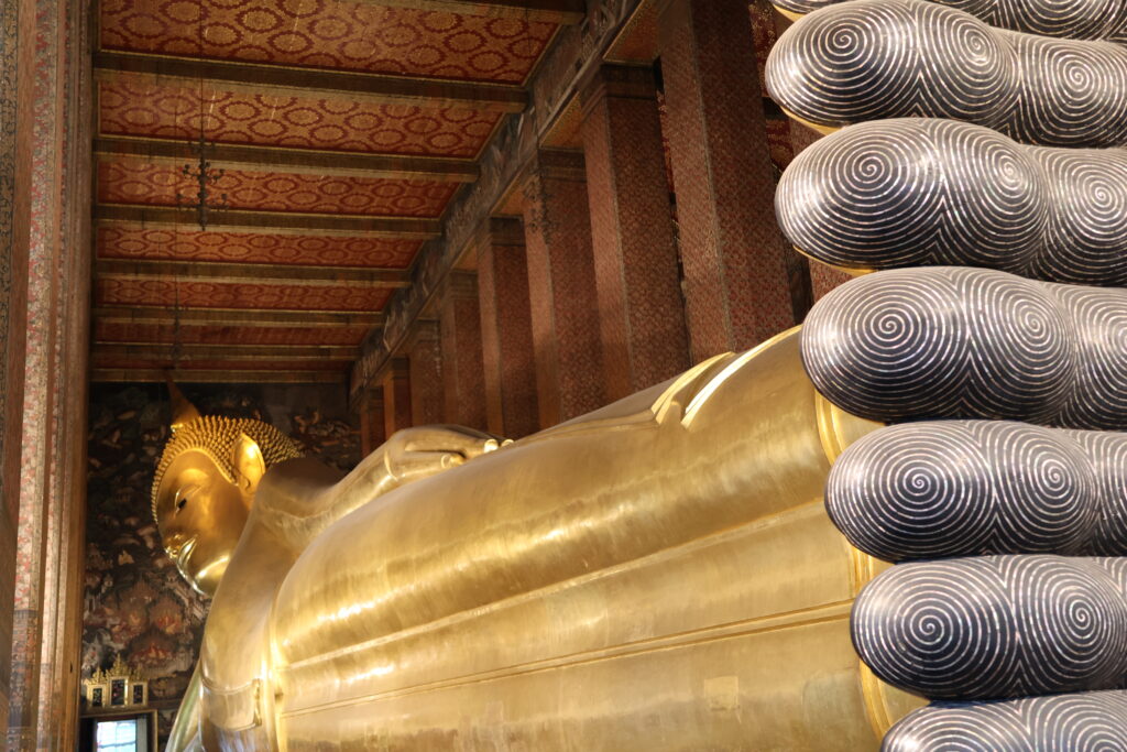 全長46m、高さ15mの黄金の涅槃像は、写真で見るよりも圧倒的な存在感がありました。周りには108個の鉢が並んでおり、一つ一つにコインを入れると煩悩がなくなると言われているそうです。