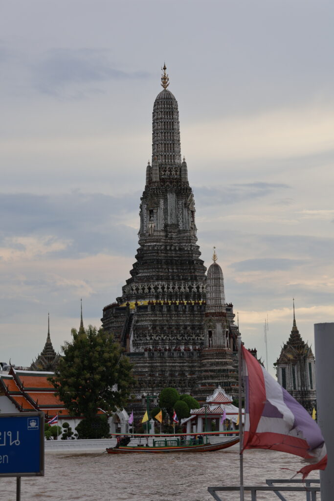 続いて訪れたのはバンコク三大寺院のワット・アルンです。川沿いに建つこの寺院には、ワット・ポーから少し歩いたところから船で川を渡って辿り着きました。